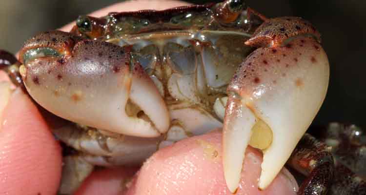 Blaasjeskrab Hemigrapsus sanguineus Blaasjeskrab Hemigrapsus sanguineus 13 februari 2025 close up van he blaasje op de scharen
